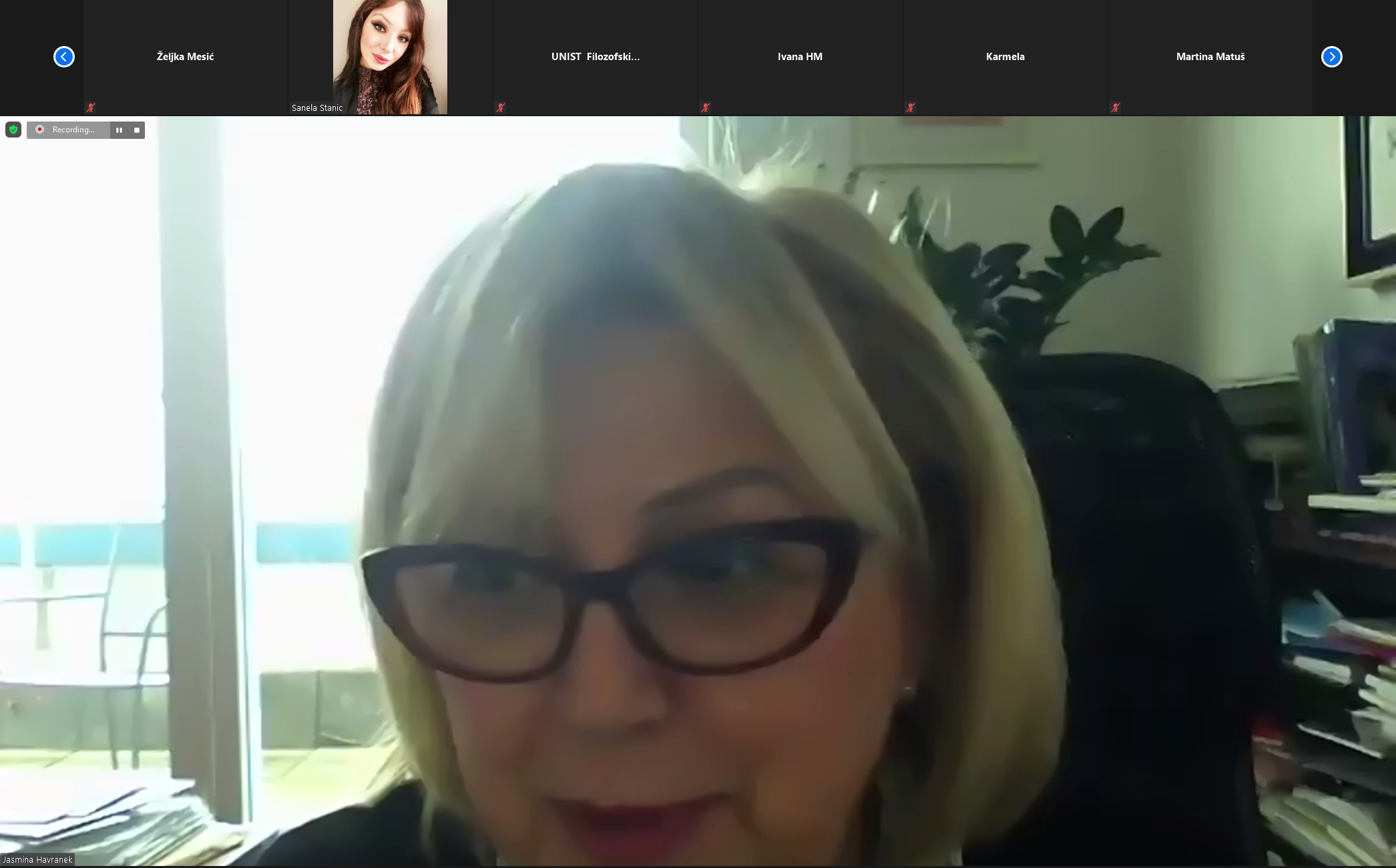 Ravnateljica Agencije za znanost i visoko obrazovanje prof.dr.sc. Jasmina Havranek, dobitnica ovogodišnje državne nagrade za znanost u kategoriji nagrade za životno djelo, održala je predavanje na temu „Inovativno visoko obrazovanje kao odgovor na izazove "korona-krize"“.