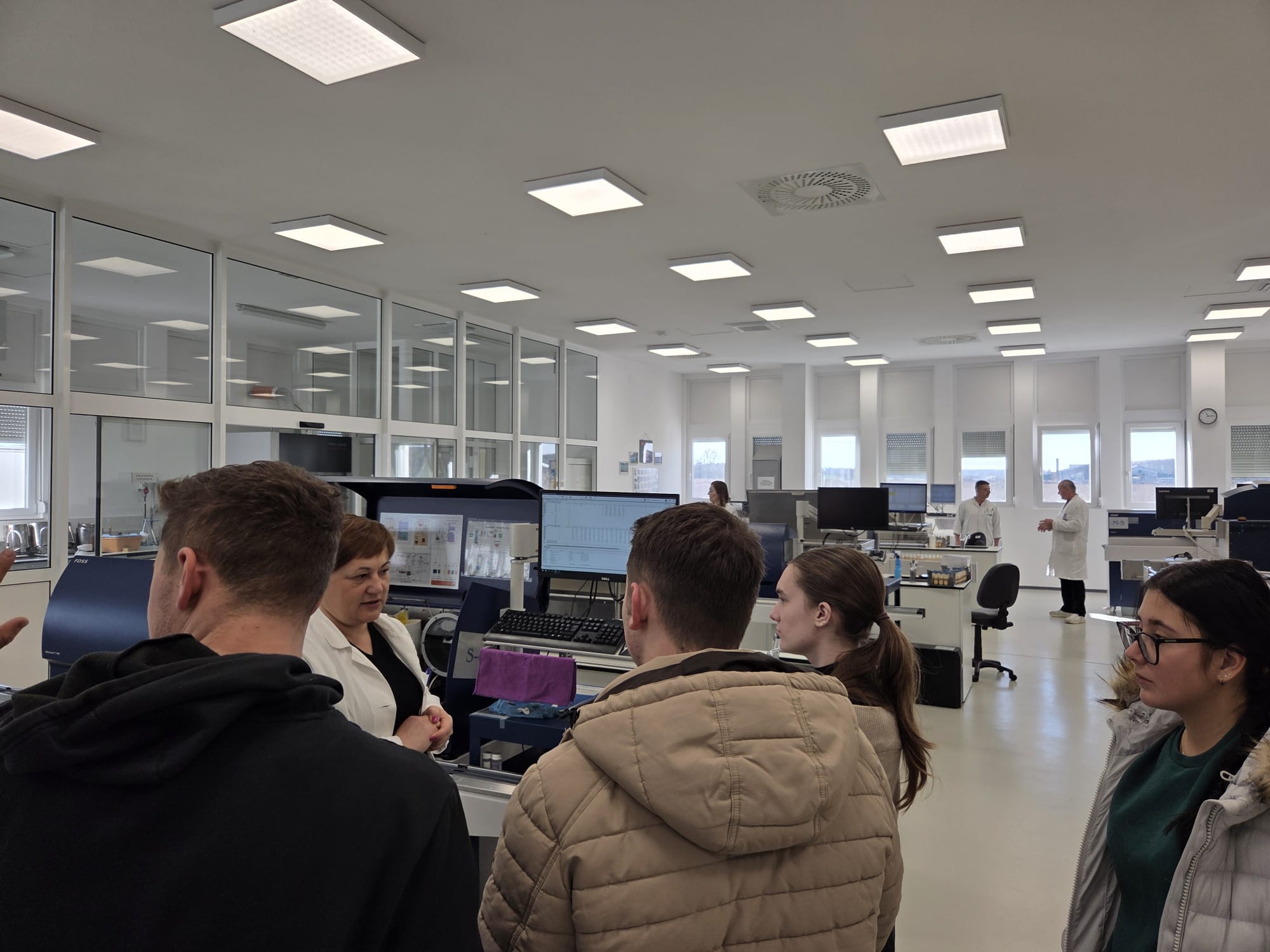 Uz stručno vodstvo Danijele Stručić, dipl. ing. agr., studenti su se upoznali s procesima ispitivanja sastava mlijeka te mikrobiološkim parametrima i standardima koji se primjenjuju u sustavu kontrole mlijeka u RH. Valja napomenuti kako je to jedini laboratorij u kojem se uz pomoć testiranja mlijeka na hormon PAG određuje gravidnost stoke.