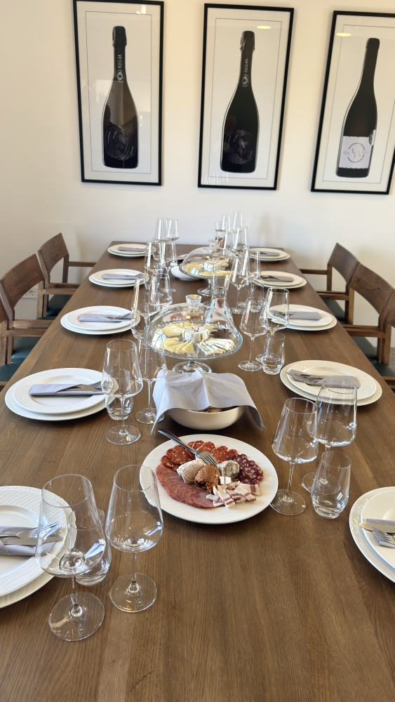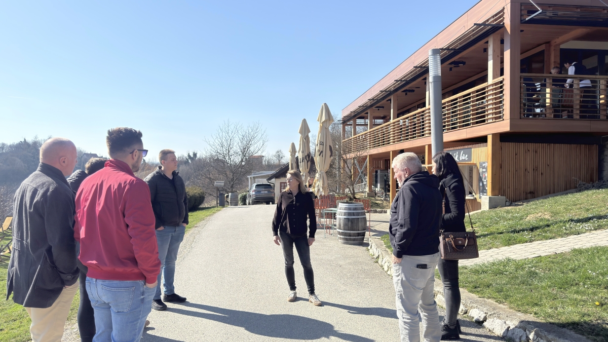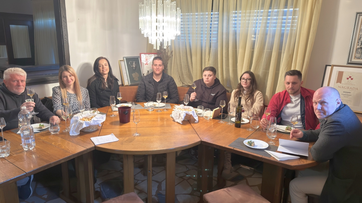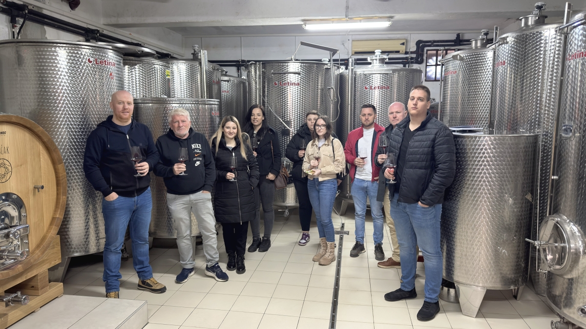 Sljedeća postaja bila je vinarija Vuglec Breg, smještena u blizini Krapine u Hrvatskom zagorju. Ova vinarija dio je turističkog kompleksa koji uključuje restoran, smještajne kapacitete i vinograde, te predstavlja primjer uspješnog povezivanja vinogradarstva, vinarstva i ruralnog turizma. Tijekom obilaska studenti su imali priliku vidjeti suvremeniju opremu koja se koristi u proizvodnji vina i pjenušavih vina, kao i dio opreme za pakiranje vina. Posebno je zanimljivo bilo upoznati se s tehnologijom proizvodnje pjenušavih vina te s postupcima koji se koriste kako bi se postigla željena kvaliteta i stil proizvoda. Također smo obišli vinski podrum, gdje su predstavljeni procesi fermentacije i dozrijevanja vina. Nakon obilaska podruma uslijedila je degustacija nekoliko njihovih etiketa, pri čemu su studenti imali priliku čuti dodatna objašnjenja o tehnologiji proizvodnje pojedinih vina i njihovim senzornim karakteristikama. U sklopu posjeta organiziran je i ručak u restoranu vinarije. Poslužena su tradicionalna jela zagorske kuhinje – patka i teletina pripremljene ispod peke uz domaće mlince. Ovaj dio terenske nastave dodatno je naglasio važnost povezivanja vina i gastronomije, što predstavlja važan segment razvoja vinskog turizma.