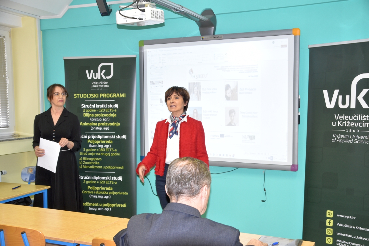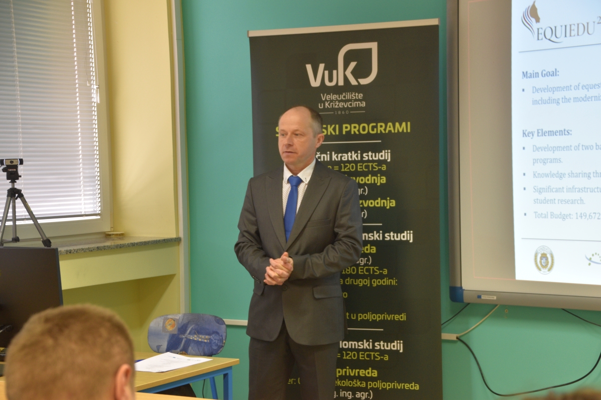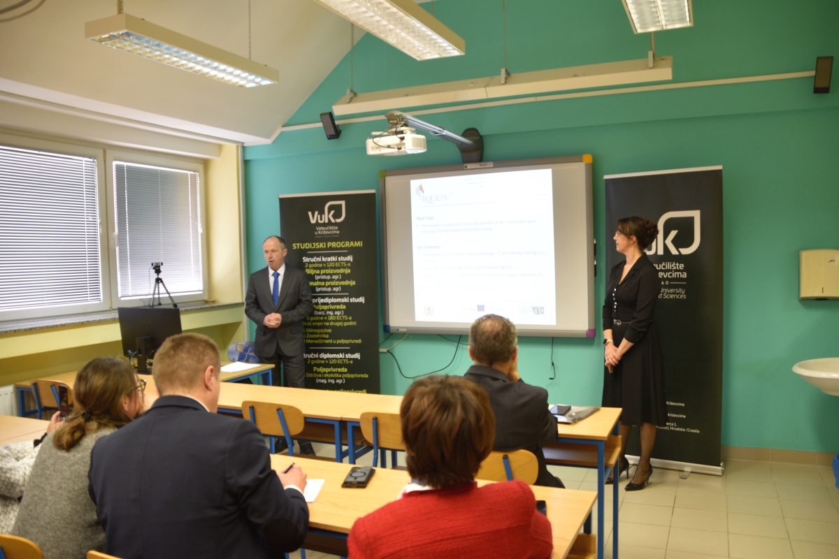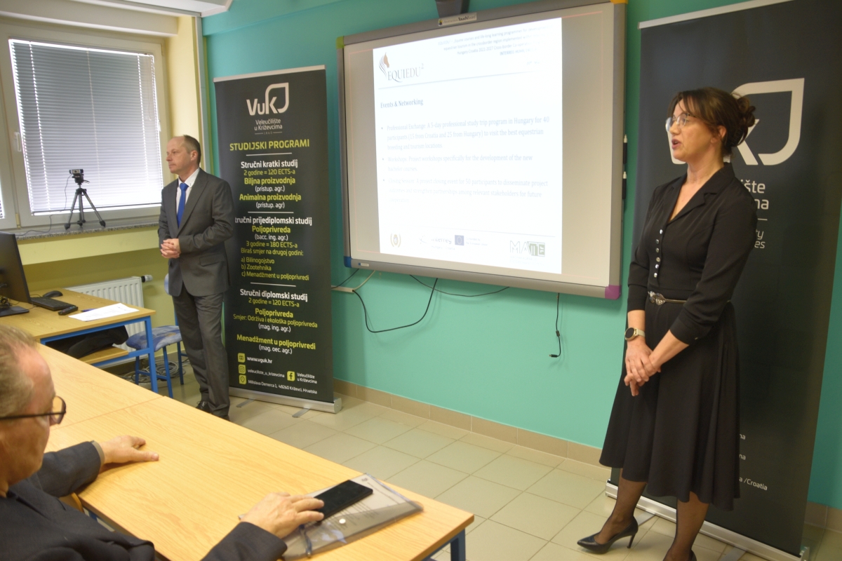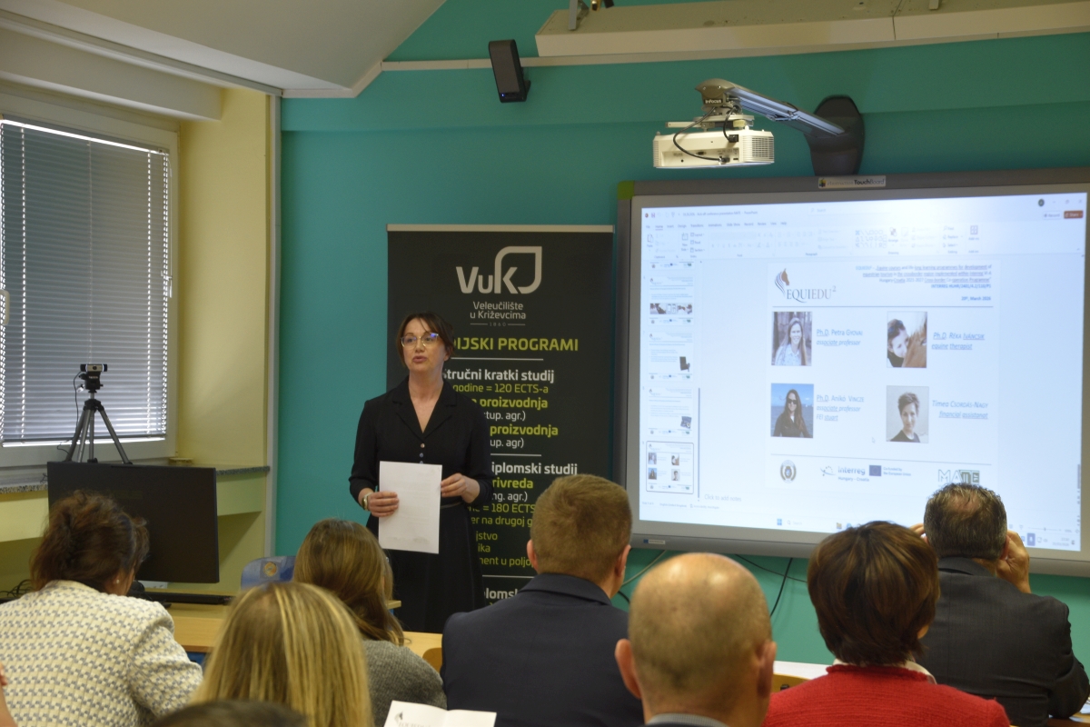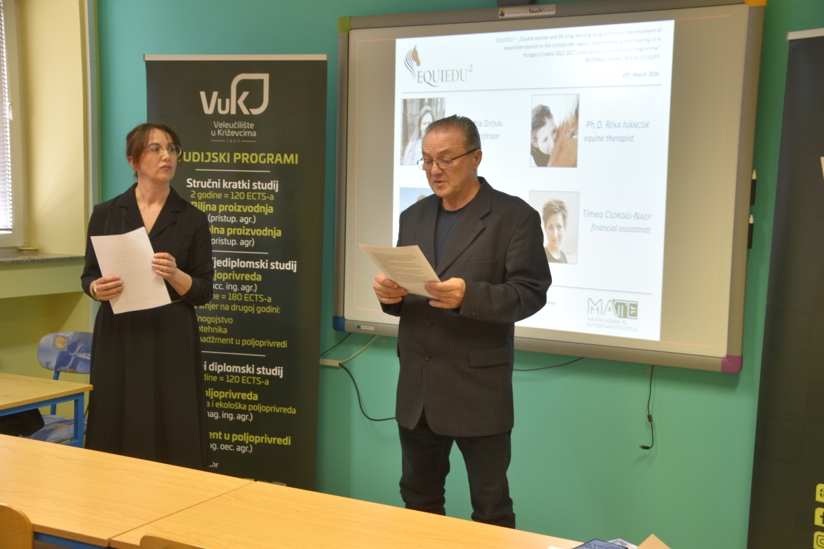 Na Veleučilištu je 20.3.2026. Svečano otvoren projekt EquiEdu2 Equine courses and life-long learning programmes for development of equestrian tourism in the cross-border region koji Veleučilište u Križevcima provodi sa Sveučilištem MATE iz Kapošvara u sklopu programa prekogranične suradnje Interreg VI-A Mađarska-Hrvatska 2021. - 2027. Na otvorenju su sudjelovali predstavnici Ministarstva poljoprivrede, šumarstva i ribarstva, profesori s Veterinarskog fakulteta u Zagrebu i Fakulteta biotehničkih znanosti u Osijeku, predstavnici Hrvatskog konjičkog saveza, Hrvatske agencije za poljoprivredu i hranu, predstavnici konjogojskih udruga koje djeluju na području Republike Hrvatske, predstavnici konjičkih klubova i zaljubljenici u konje i konjički sport. Otvorenju je nazočio i gradonačelnik Križevaca, gospodin Tomislav Katanović, koji je u prigodnom obraćanju prisutnima čestitao Veleučilištu na dobivenom projektu i naglasio važnost kontinuiranog razvoja novih atraktivnih programa u području visokog obrazovanja. Dekanica Veleučilišta, Marcela Andreata-Koren u svom je obraćanju istaknula važnost ovakvih projekata za Veleučilište, a predstavnik Hrvatskog konjičkog saveza i Hrvatske udruge uzgajivača sportskih konja, gospodin Željko Gagro, osvrnuo se na učinke koje će projekt imati za dodatno osnaživanje konjogojstva i konjičkog sporta u Hrvatskoj. Voditelj projekta za Sveučilište MATE iz Kapošvara, gospodin Arpad Bokor, predstavio je aktivnosti koje će se zajednički provoditi u Kapošvaru, a u kojima će sudjelovati nastavnici i studenti VUK-a, kao i predstavnici uzgojnih i sportskih udruga vezanih uz konjogojstvo i konjički sport. Na Veleučilištu u Križevcima će se u sklopu provedbe projekta EquiEdu2 razvijati novi predmeti na diplomskim stručnim studijima, provest će se i akreditirati dva programa cjeloživotnog učenja i pribaviti vrijedna oprema za konjogojski praktikum. Projekt se provodi od 1.3.2026. - 28.2.2028.