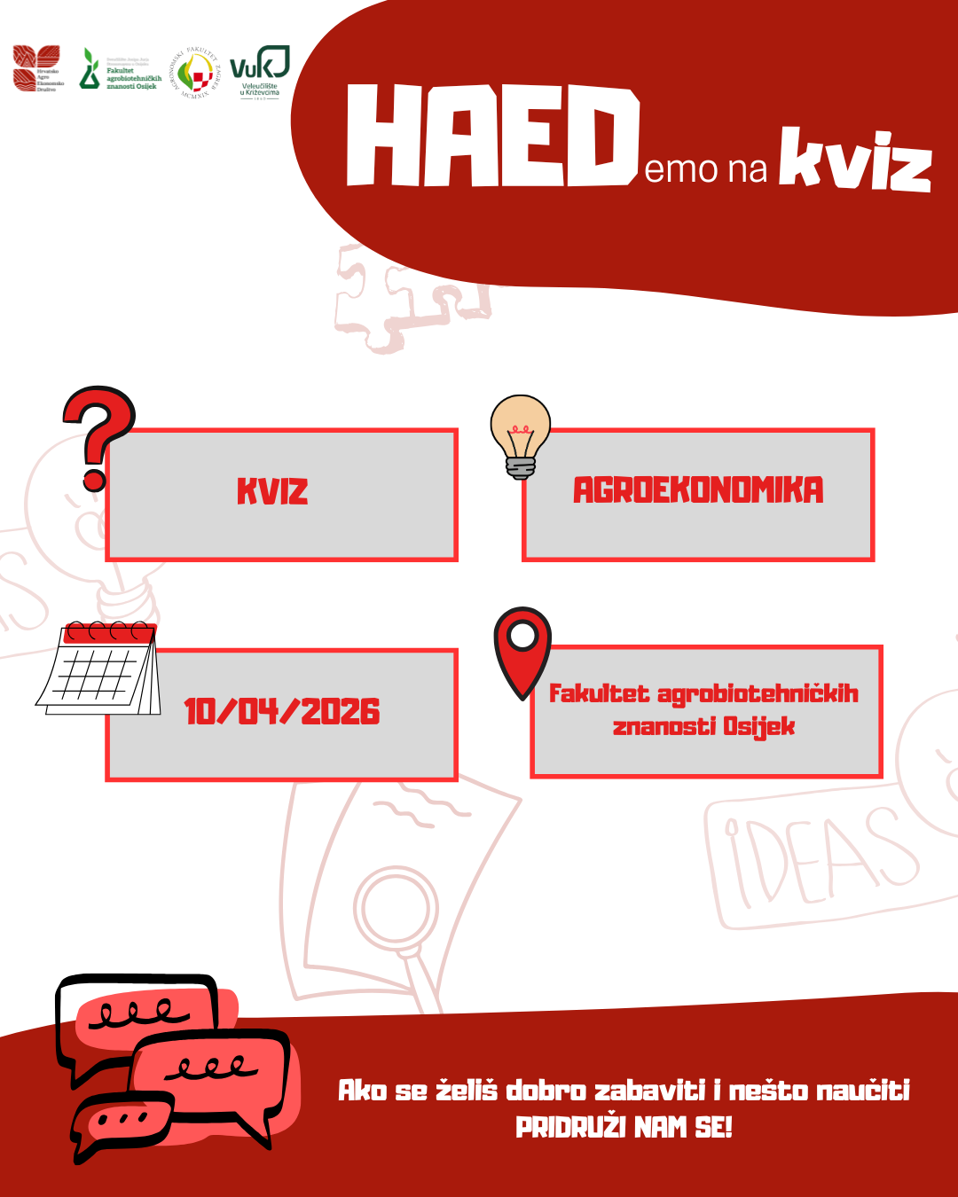 Hrvatsko agroekonomsko društvo poziva Vas na tradicionalni PUB KVIZ za studente, koji će se održati u petak, 10. travnja 2026. godine na Fakultetu agrobiotehničkih znanosti u Osijeku.